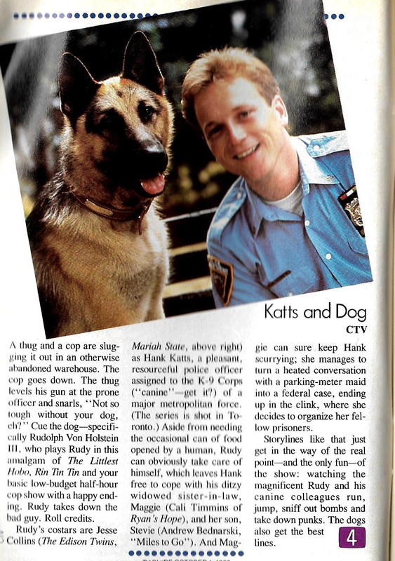 You might think those were the inspirations for "Rex." But then I came across this very obscure Canadian show that was produced for CTV for one very unsuccessful season back in 1988. It was called "Katts and Dog," and the logline in TV Guide's Fall preview issue sounds suspiciously like the show currently being made in Newfoundland.
