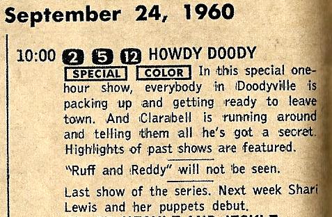 My how times have changed. My memory of the show doesn't go back all that far, but I do remember being told about the very last one, listed in the Dec. 24, 1960 edition of TV Guide. It was a long, long time ago, but the premise of that final episode was that Clarabell, the silent clown, had a big announcement. As the camera zoomed in at the last minute, it focused on his face and he spoke for the first time ever.