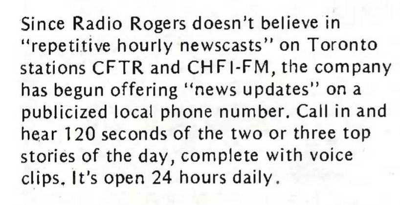 CFTR always had a great newsroom, at least in the days I was there during the Top 40 era. They went rock in 1972, and according to this article, they didn't want too much of it on their airwaves. The irony compared to their current format can't be lost on anyone.