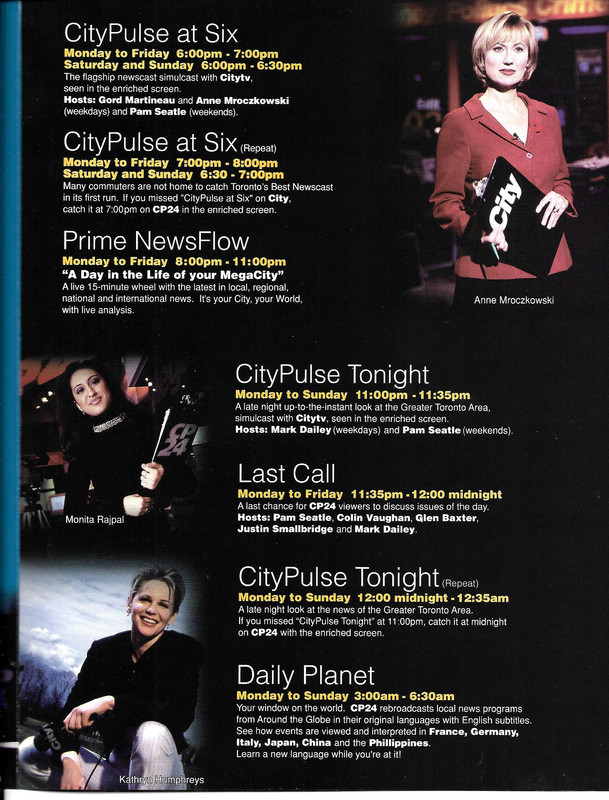 Wow, I forgot that CP24 had actual shows...thanks for sharing that old programming deck. Lots of names I hadn't thought of in years. I'm never up at that time but airing internationally produced news shows overnight is a neat programming idea to fill the dead spaces but I suppose reruns are more affordable.