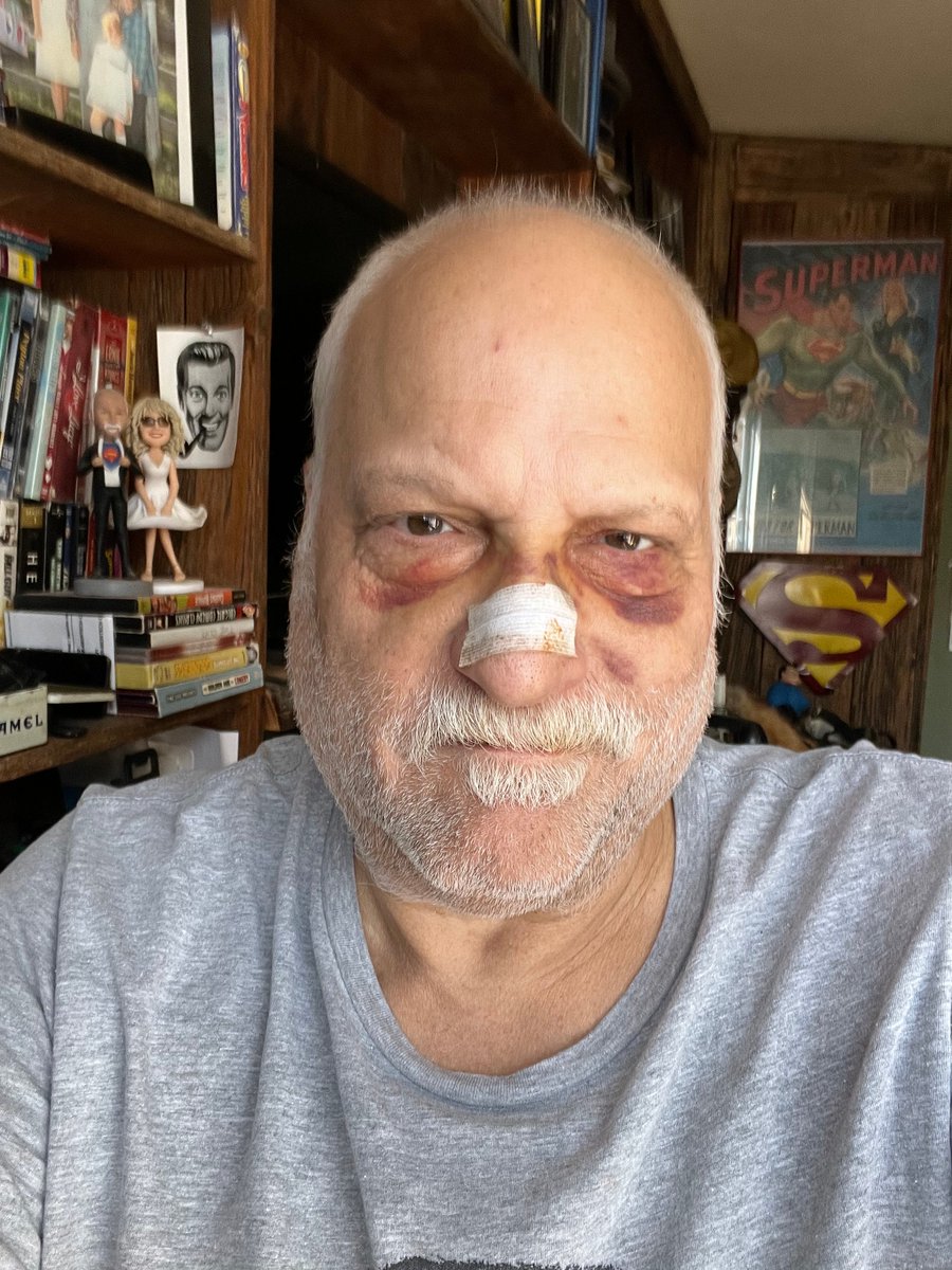 The most prominent has to be former Toronto Star entertainment reporter Rob Salem, after he was confronted by a crazed man at the Davisville station, who spit on him for no reason. Salem admits he shouldn't have reacted the way he did, shoving the guy out of the way hard. His younger assailant responded by attacking him violently, leaving him with two black eyes and a broken nose. (The pic from his Twitter page is posted below.)