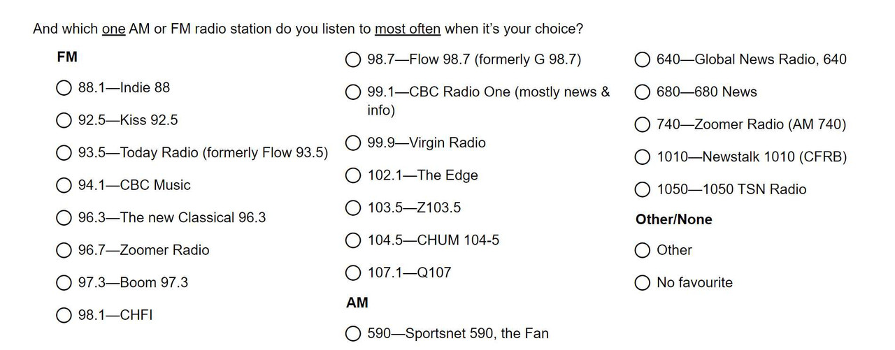 Why have Lite 88.5 and Sauga 960 been left of their list of AM/FM stations listened to in a typical week, or which one do you listen to most often... ?