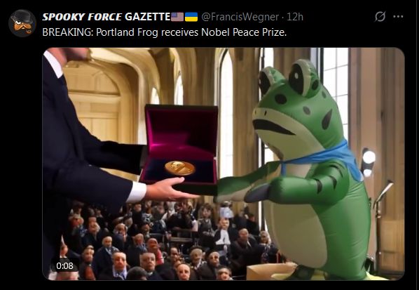 There are many things that may happen with AI in the future: it could turn on humanity and wipe us out, enslave us, or take away all of the well-paying jobs and cause a massive global Depression. But for today, it can generate videos of a protestor frog accepting the Nobel Peace Prize (instead of Donald Trump) and that alone justifies its existence: