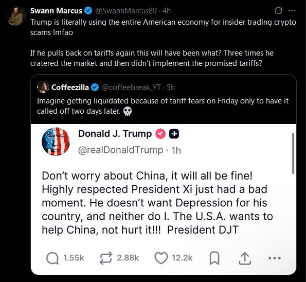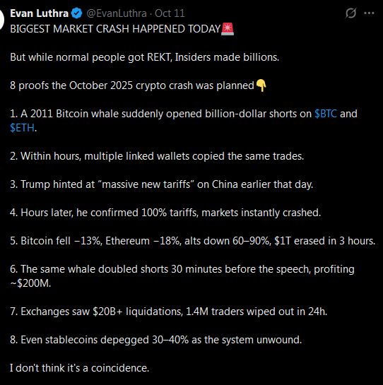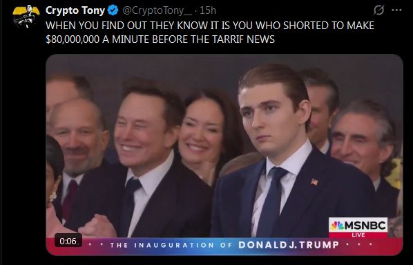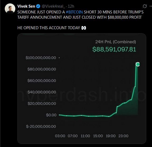 Obviously the community quickly latched onto the idea that there is someone within Trump's inner circle who knew in advance about the announcement and considering that the stock market and crypto market were known to be overvalued, and considering the effect that Trump announcing tariffs had on the markets the last time back in April, it is an easy bet to make and this person went all-in.