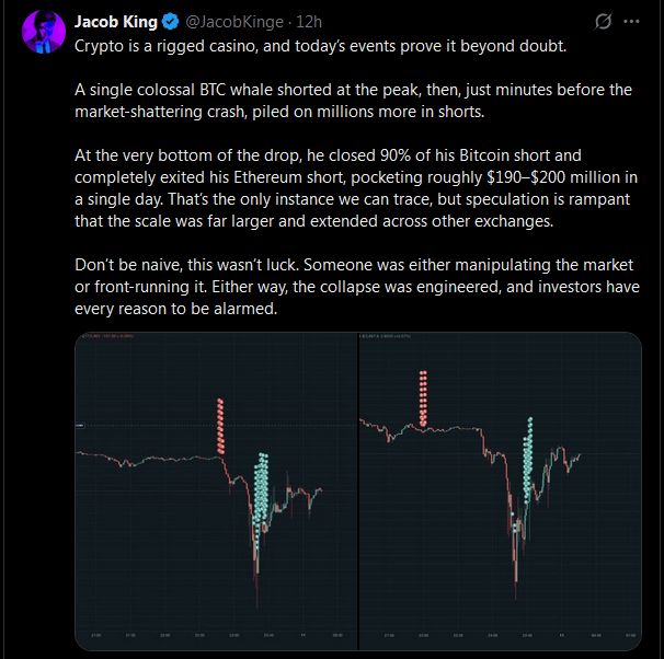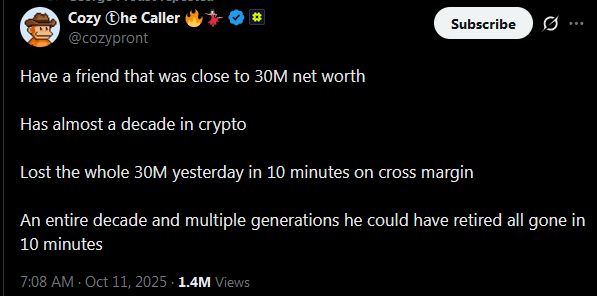 Ukrainian crypto trader Konstantin Galish — also known as Kostya Kudo — was found dead from a self-inflicted gunshot wound inside his Lamborghini in Kyiv following the market rout that wiped out roughly $19 billion and liquidated over 1.6 million accounts. Police reports and family statements indicate that he was experiencing severe depression and financial difficulties related to client funds lost in the crash, having reportedly lost more than $30 million tied to trading and investments
