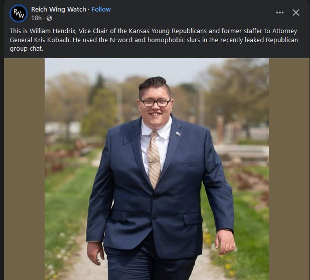 William Hendrix —  Dwyer’s vice chair in the Kansas organization, Hendrix has no problem dropping the N-word and homophobic slurs throughout his texts. A former communications director for Kansas Attorney General Kris Kobach, Hendrix also likes to engage in blatant racist stereotyping, as when he wrote: “Bro is at a chicken restaurant ordering his food. Would he like some watermelon and Kool-Aid with that?”