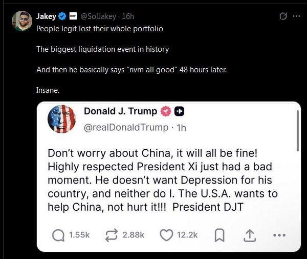 The end result of Trump's tweet: Bitcoin & crypto market records largest single-day liquidation in history, $19 billion was liquidated in 12 hours, of which $16 billion were long positions (i.e. people who would've reaped huge gains if the crypto market kept going up).