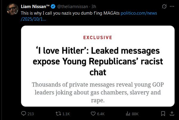 These young Republicans are very much products of the MAGA generation that Charlie Kirk helped shape. Kirk’s Turning Point brand encouraged a style of politics that celebrated provocation over principle—and now his followers trade Nazi jokes and racist banter online as the natural outcome of years spent normalizing bigotry in the name of “free speech.” This is the legacy he leaves behind: a generation that confuses cruelty with courage.