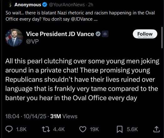 NOTE that JD Vance unintentionally admits that he, Trump, and other senior Republican officials make WORSE comments about Jews, blacks, gays, etc. in the Oval Office every single day. Brilliant.
