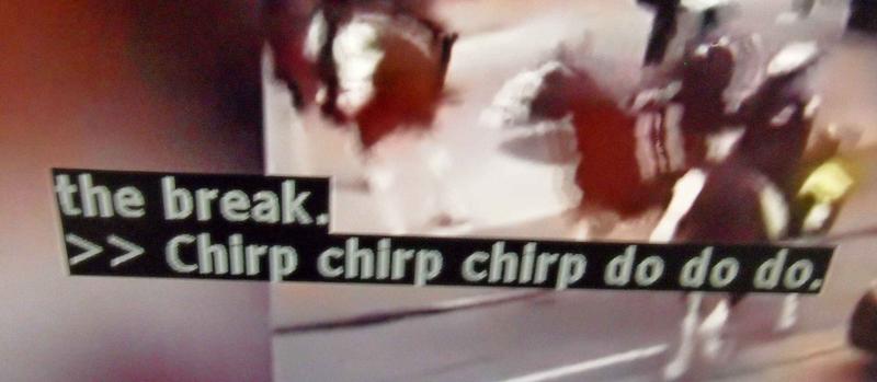 And then, just before the first commercial started, she began singing along playfully and quietly to the theme music. That's fine and a bit charming, but they hadn't killed her mic and it went out on air. But I was stunned to see that the closed captioning had picked up on this impromptu moment, which resulted in the odd CC you can see below.