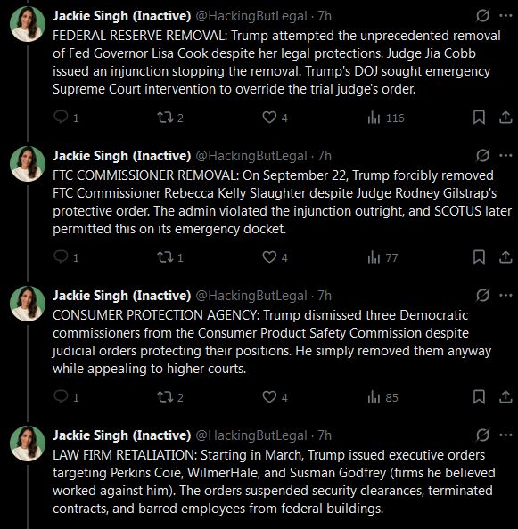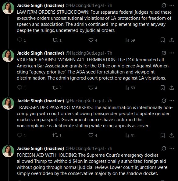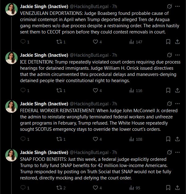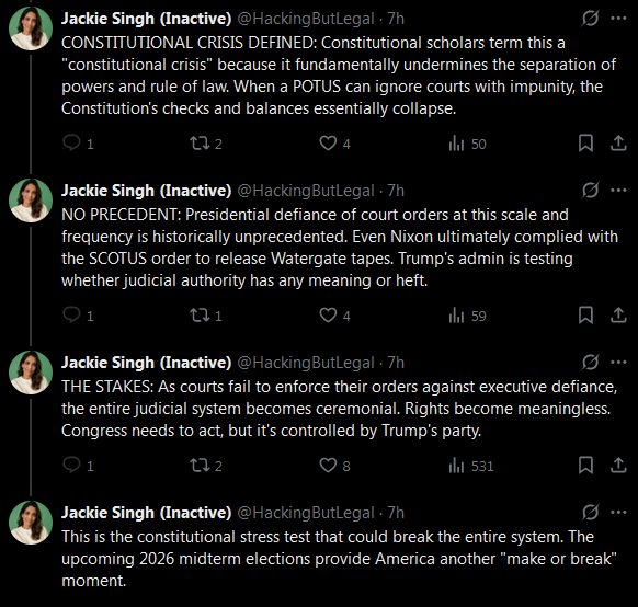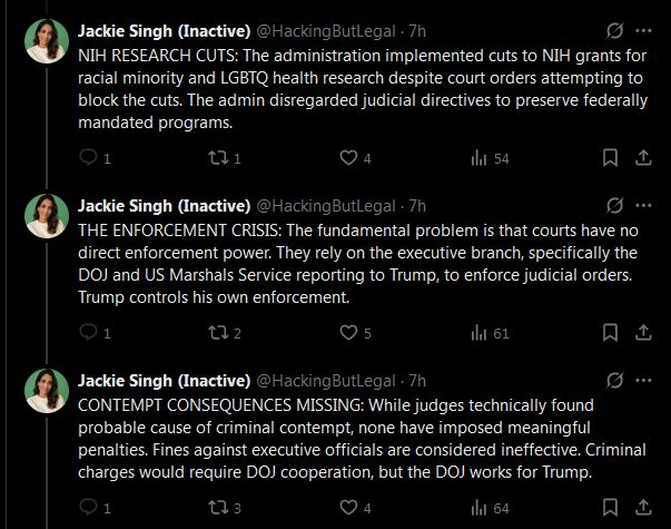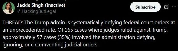 Jackie Singh offers a good explanation of why Trump's regime basically gets away with anything it wants to, regardless of whether the courts rule against their actions or not. Of course, the Supreme Court itself is in Trump's back pocket ever since he appointed 3 conservative judges to the SC and gave the Republicans the advantage in any final rulings. Lower courts have been more defiant against Trump, but they all rely on enforcement of their rulings by... Trump's government.