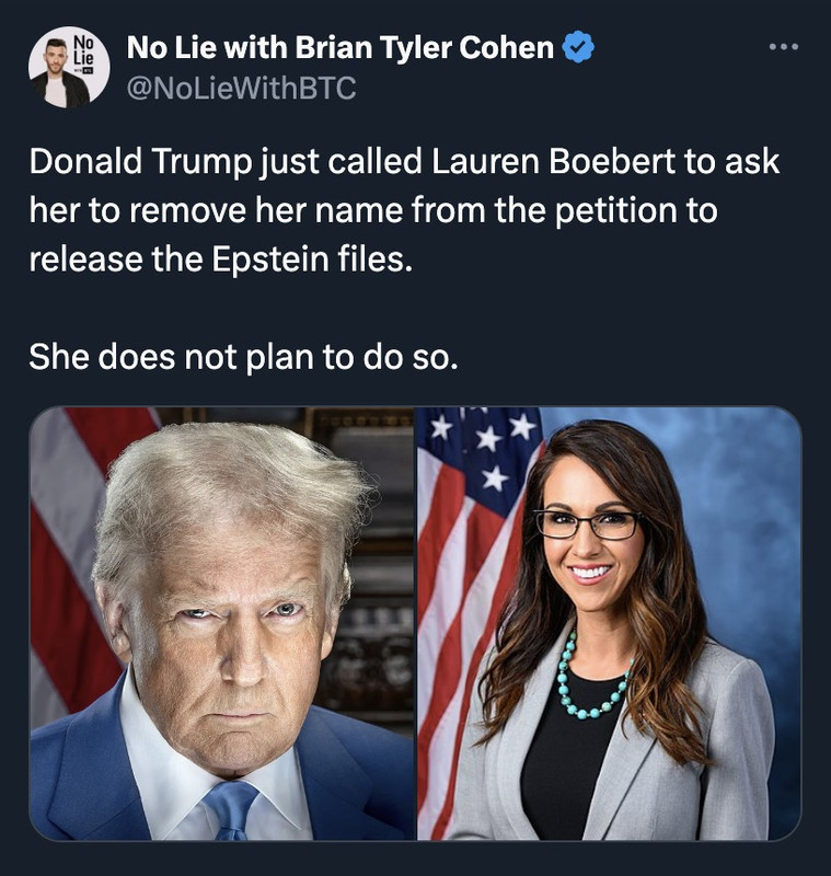 Two Republicans, famous for being both batshit crazy and loyal Trump supporters have recently turned on Trump by signing the declaration for the Epstein Files to be released. I already mentioned Marjorie Taylor Greene (who then started acting paranoid and told her followers on social media not to believe any stories about her being suicidal if she were to die...) but there's also Lauren Boebert.