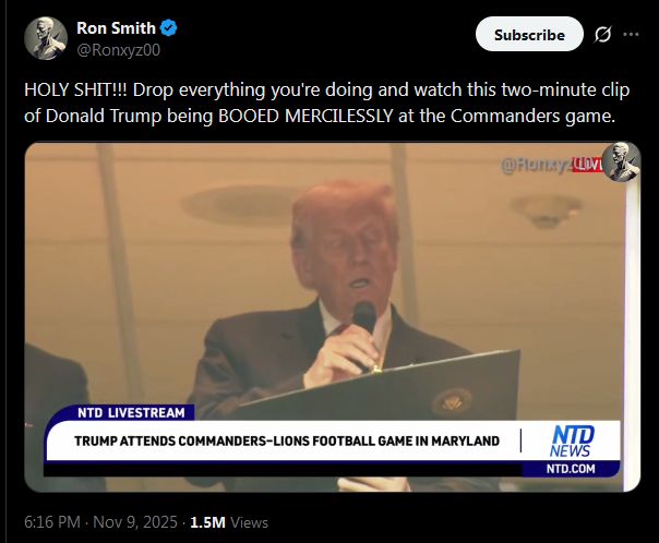 Some of the loudest booing I've heard so far as Trump makes an appearance at the Washington Commanders NFL game: