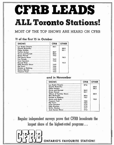 We think of today's radio in terms of stations and dayparts, instead of individual shows. But this CFRB ad from Jan. 1947 shows what was popular back then - and how very different radio was before music formats took over almost every station.